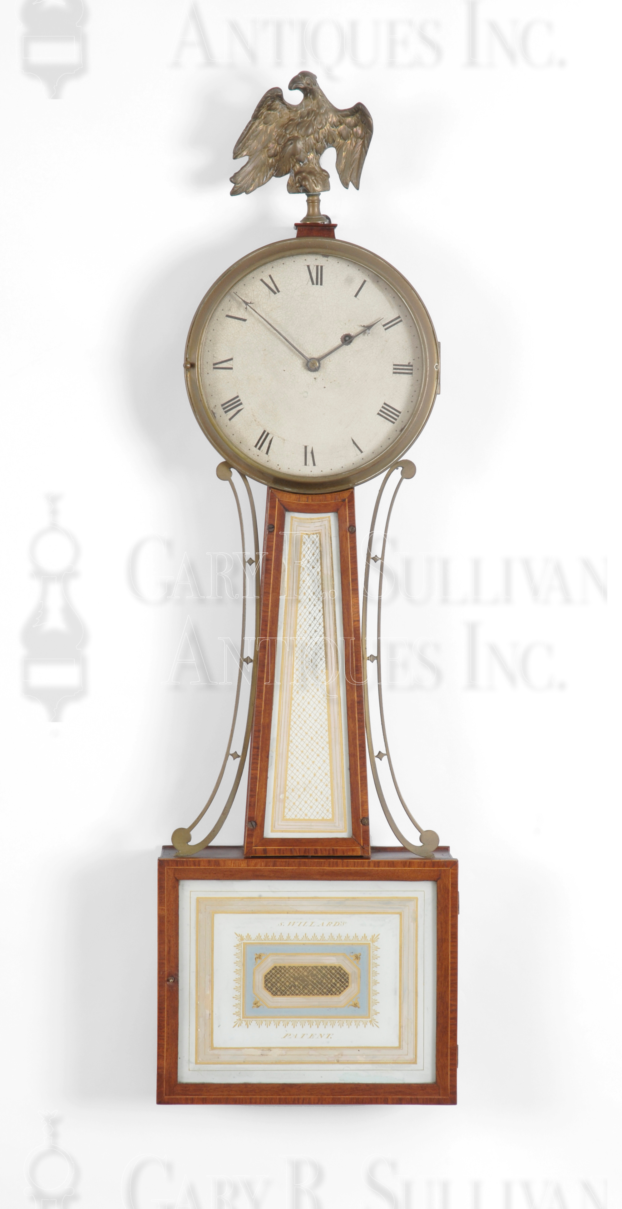 This handsome clock is among the first generation of these antique patent time pieces produced by the innovative clockmaker Simon Willard [1753-1858] of Roxbury, Massachusetts. This successful form was patented by Willard in 1802 as the “Improved Timepiece” but is more commonly referred to as a “banjo” clock. Examples like this, with cross-banded frames and understated geometric eglomisé panels, were made in the shops of Simon Willard during the first years of his patent. Although numerous fine examples of patent time pieces we made by his apprentices over the next twenty-five years, these rare, early examples are the most prized. This clock is in fine original condition and retains an original fire gilt cast brass eagle finial. This lower panel is inscribed in gilt lettering, above and below the cross-hatched oculus, “S. Willard’s / Patent.”. The tapered lead weight with “duck bill” hook and steel pendulum rod with brass-capped bob are original to the clock.
