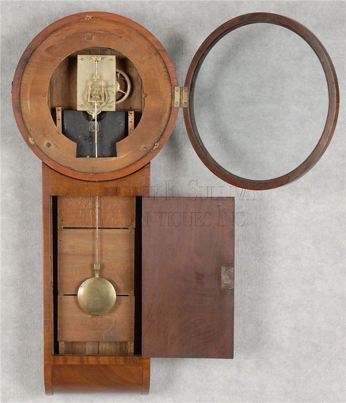 A rare mahogany antique tavern clock, by Joseph Nye Dunning, Burlington, Vermont circa 1825. This rare American eight-day mahogany tavern form time piece is signed with the name of the prolific clockmaker Joseph Nye Dunning (1795-1841). Dunning began his career in Concord, Massachusetts in partnership with Lemuel Curtis, where they produced a number of fine clocks. The pair moved to Burlington, Vermont in 1821, where Dunning continued his career. Tavern clocks are among the rarest of American clock forms. The glazed dial door has a cove molded bezel which opens to a painted iron dish dial with Roman numerals to demark the hours and Arabic to demark the minutes. The dial is signed below the center arbor, “J. N. Dunning”. The rectangular lower case has a hinged pendulum door above a rounded pediment. The pendulum door and case are veneered with finely figured mahogany. The door conceals a pendulum with a brass capped bob and an iron rod. The clock retains the original cast iron weight and wooden weight divider.